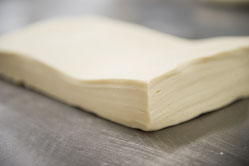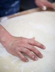 刻々と変化する熟成具合など、機械ではなかなか見ることができない生地の状態をしっかりと見極めながら打つことができる。だから、山田家では職人が日々「足踏み・菊揉み・手打ち」を続けています。手や足を使って作業をすることで、徐々に生地の状態がわかるように。生地の感触を足で感じながら、負担をかけないように優しく優しく鍛えていくのが、足踏み。縦と横からしっかり鍛えたら、次は菊揉みで円状に圧力をかけ、グルテンの層を複雑にしていきます。そうして鍛え上げられた麺を、さらにどこまで打てばよいか確認しつつ、手打ちでなめらかな麺へと仕上げていきます。これらのどの工程であっても無理な力を加えるのは厳禁。麺の表面が荒れ、気泡が入ってしまい喉越しが悪くなったり、茹でた際に麺がブチブチとちぎれる原因になるのです。